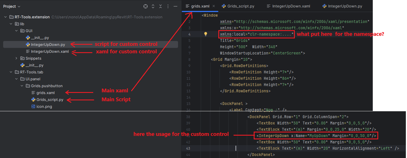 I am developing a tool for Autodesk Revit using the pyrevit extension and IronPython. For this, I have implemented a custom control called IntegerUpDown, which I need to use in my tool. I tested the control in Visual Studio, and it works well. However, I am struggling to use my control in pyrevit by referencing it's name space in my main xaml file, considering the structure of my project attached below: