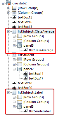 - I succeeded to show the grade for each student by flattening the data into rows of student-subject-grade inside the class and grouping inside the crosstab. But this solution doesn't suits us because it duplicates data for each student (name, surname,..) and each subject.