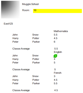 Each report page must display one class with a crosstab. The crosstab must display the grades of each students for each subjects.