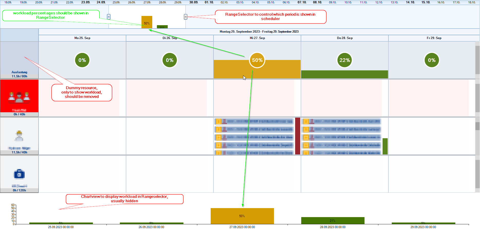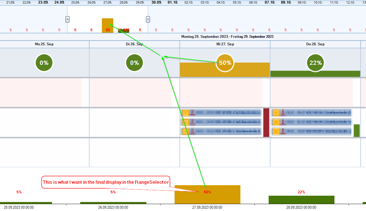 I want to implement some custom renderings or a overlay for a radChart. I added a screenshot of my application with some annotations. My goal is to remove the dummy resource from the scheduler. The cells of the dummy resource are only used to show workload-percentages. But before I can remove it, I need to display the workload in the ChartView, more precisely in the RangeSelector.