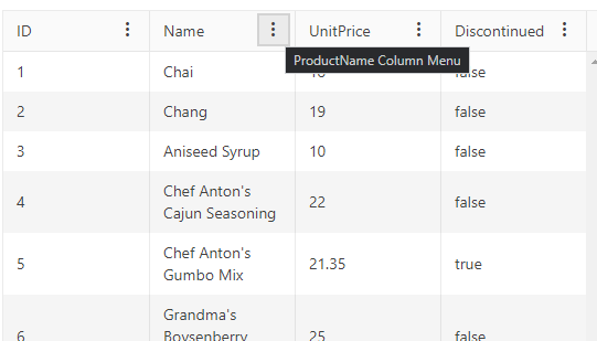 On this example, instead of the "ProductName Column Menu" tooltip text, I'd like to display some other user friendly text, or just have this tooltip removed. Is it possible?