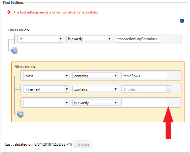 The feature under test is as follows: A user fills out a form, submits the form, and two rows are created in a transaction log. The transaction logs are rows in a table on the page and display information from the submitted form. The test goes through the workflow of filling out the form, submitting the form, and validating that the expected transaction logs appear. Part of validating the transaction log is to verify that a table row exists with the data values entered into the form. I hoped to build a find expression looking for a table row with inner text containing several values from data, because finding such an element verifies that the correct transaction log was created. Using only one data column in the find expression does not guarantee finding the correct element, because only the combination of the data values guarantees a unique row.