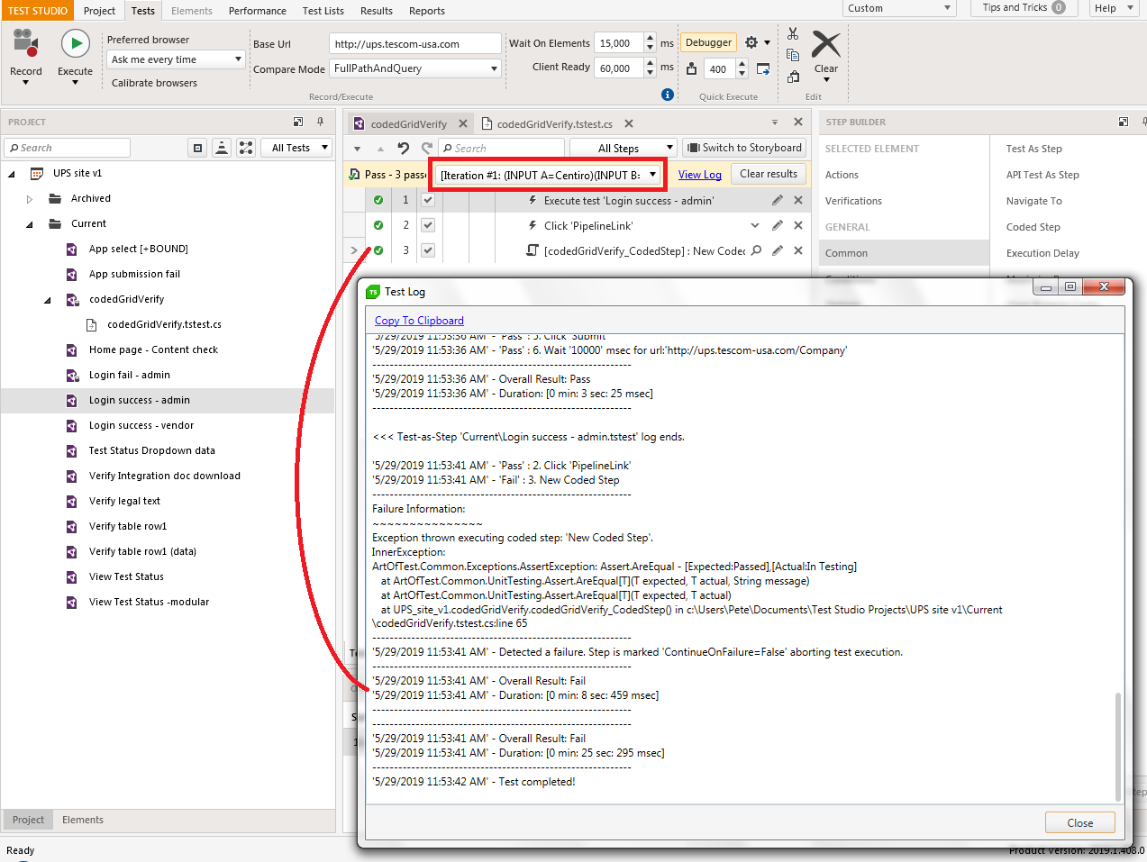 When you use data driven testing in a Test List, the results from all iterations are summarized in the Test Results pane. You can drill down to find the exact step, which failed and check the step failure details.