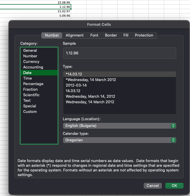 Catogory is displayed as "General",  instead of date and any of the possible types-formats