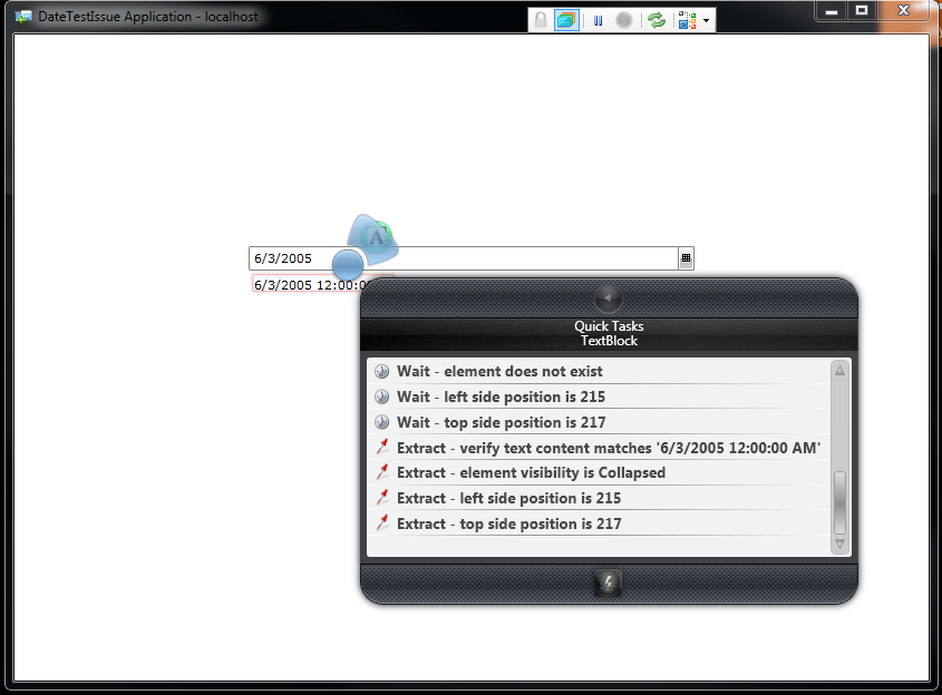 '7/13/2012 6:15:52 PM' - 'Fail' : 1. Extract 'x672005Textblock' text into DataBindVariable $(extractedDate)------------------------------------------------------------Failure Information: ~~~~~~~~~~~~~~~[Silverlight Extension Error] Details: ArtOfTest.WebAii.Silverlight.NoSuchPropertyException: Property 'Text' does not exist on the element at Telerik.TestingFramework.XamlExtension.ClientServices.GetRealProperty(AutomationReference reference, AutomationProperty property) at Telerik.TestingFramework.XamlExtension.ClientProcessor.ProcessCommand(String command)InnerException:ArtOfTest.WebAii.Silverlight.ExecuteSilverlightCommandException: [Silverlight Extension Error] Details: ArtOfTest.WebAii.Silverlight.NoSuchPropertyException: Property 'Text' does not exist on the element at Telerik.TestingFramework.XamlExtension.ClientServices.GetRealProperty(AutomationReference reference, AutomationProperty property)