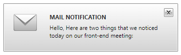 private void ShowAlert_Click(object sender, RoutedEventArgs e) { RadDesktopAlertManager manager = new RadDesktopAlertManager(); var alert = new RadDesktopAlert(); { alert.Header = CreateAlertHeaderContent("MAIL NOTIFICATION"); alert.Content = "Hello, Here are two things that we noticed today on our daily meeting."; }; manager.ShowAlert(alert); } private UIElement CreateAlertHeaderContent(string text) { var textBlock = new TextBlock() { Text = text }; var image = new Image() { Source = new BitmapImage(new Uri("C:\\Users\\dihristo\\source\\repos\\Week 12\\Monday\\DesktopAlert_AddImage\\weather.png", UriKind.RelativeOrAbsolute)), Width = 30, Height = 30 }; var stackPanel = new StackPanel() { Orientation = Orientation.Horizontal }; stackPanel.Children.Add(image); stackPanel.Children.Add(textBlock); return stackPanel; }3- What is the name of the following theme?