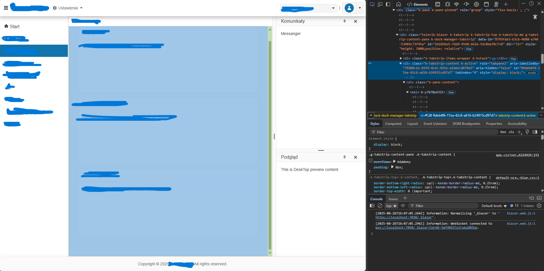Dockable="false">- The content area receives both k-pane-content AND k-tabstrip-content classes.