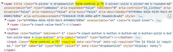 <kendo-dropdownlist for="Id" datatextfield="Name" datavaluefield="Id" auto-width="true"> ... </kendo-dropdownlist> <script> $(document).ready(function(){ $("#Id").addClass("form-control w-75"); // add the class to the hidden input element $("#Id").attr("required", "required"); $("#Id").closest("span.k-dropdownlist").addClass("form-control w-75"); // add the class to the wrapper element }); </script>Here is the updated REPL for your reference: https://netcorerepl.telerik.com/movvmZFv180zTiFH20