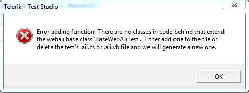 "Error adding functions: There are no classes in code behind that extend the webaii base class 'BaseWebAii'. Either add one to the file or delete the tests's .aii.cs or aii.vb file and we will generate a new one."