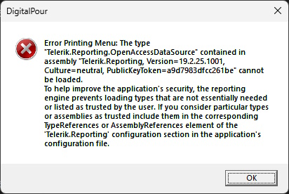 After using Telerik reporting for over 10 years, with the latest update we are now getting this error when trying to print a report.