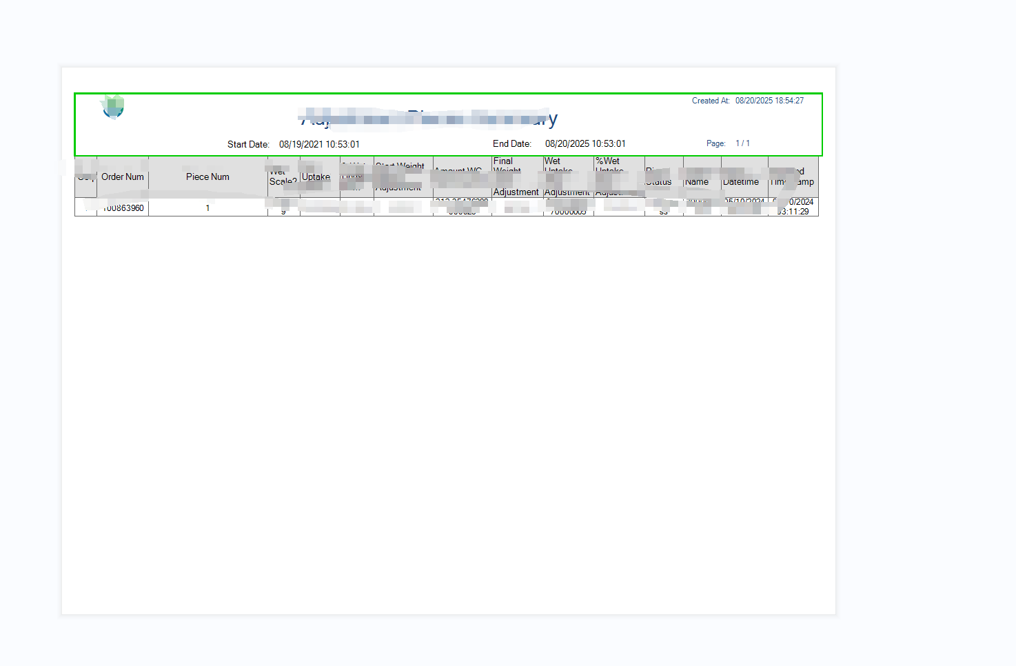 <?xml version="1.0" encoding="utf-8"?> <Report Width="29cm" Name="AdjustmentPiecesSummary" Zoom="1.5" SnapGridSize="0.1cm" xmlns="http://schemas.telerik.com/reporting/2021/2.0"> <Style> <Font Name="Arial Unicode MS" /> </Style> <DataSources> <SqlDataSource QueryDesignerState="null" ParameterValues="{"@StartDateTime":"'2024-03-14 15:20:19.000'","@EndDateTime":"'2024-03-16 15:20:19.000'"}" ConnectionString="= Parameters.PFDSConnectionString.Value" ProviderName="System.Data.SqlClient" SelectCommand="[AdjustmentManager].[pr_AdjustmentManager_LoadPiecesSummary]" SelectCommandType="StoredProcedure" CommandTimeout="90" Name="pr_AdjustmentManager_LoadPiecesSummary "> <Parameters> <SqlDataSourceParameter DbType="DateTime" Name="@StartDateTime"> <Value> <String>= Parameters.startDateTime.Value</String> </Value> </SqlDataSourceParameter> <SqlDataSourceParameter DbType="DateTime" Name="@EndDateTime"> <Value> <String>= Parameters.endDateTime.Value</String> </Value> </SqlDataSourceParameter> </Parameters> </SqlDataSource> </DataSources> <Items> <PageHeaderSection Height="2.4cm" Name="pageHeaderSection1"> <Style> <BorderStyle Default="Solid" /> <BorderColor Default="0, 204, 0" /> <BorderWidth Default="2pt" /> </Style> <Items> <TextBox Width="4.277in" Height="0.354in" Left="8.2cm" Top="0.5cm" Value="Adjustment Pieces Summary" Name="adjustmentPiecesSummaryTitle"> <Style Color="31, 73, 125" TextAlign="Center"> <Font Size="22pt" Bold="True" /> </Style> </TextBox> <PictureBox Image="iVBORw0KGgoAAAANSUhEUgAAACUAAAAlCAIAAABK/LdUAAAABGdBTUEAALGPC/xhBQAAAAlwSFlzAAAOvAAADrwBlbxySQAAC0FJREFUWEe9lXlcU1cWxy8oiNa21ulmHVtb/bQ6TmuXkVqdjlpCUAZRCyqKKyjuBgKETUkgEPYA2UmALGTf94RdKAgiiyCCKIIoigubsth1mPtIikt1nD/mM7/P++fdd8753nPuueeBiZfpVt8tQ5WGZIrGFvoftG4IsLgdsLgFWd2Ci70J1gNsa9rZxsrR0RG79cv0n3i9t3vzizknDAE7jZ5+JvcdJnd/s/tui/teK2q/FYWArW5BhaiThd4kY0jRWePY+Jjd88V6Pu+XX34x15iD9Ae8DOiNBvQmg7uffuNh7W6c+jheFY7XhIVrDx01bttnWQ/Z+yxugYWoI0Weaabojs52e4gX6Dm8kdERehHzn/pNKC0arfMI0OxjmOkNrQ2DQ4M///zzvyb16NGjnt6eohprihF/0Pz9Lgtqtwm1z4oKNe+qqC+DBvZYf9CzvNGx0URz2hqd59816I2arUwLq+9u3/CD4drmWkFRAVlPTtOmMkw0U5Wxs/sqtIehGy/VE83RO03r/YwofzPqiNm3uNZqi/ZHPcWDZaQV5X6t8VqhQm9XB1Q3nYU5icol+zWHUXqvdQYPN4OHu9EDbfLw0KP9tNvi9ITzF89DR1gSXmmev3mTjwG1zYg6ZNxe13LOFvMZPcUrrCtbqdjxqczbV3G4rbO9vavjiC58pW49Wu0Tqopim3PlpQphkShZlxqgPojWbUDp0b66rblFueOPxn/77TdZhXSr0dtbh9picA/RH+67c9se9wk95t3rv79Zhlsk3LZKElDTUnfxyqXNqmN/U/hEqomtVy79+OOPMIkHDx/AI4TGQ8ND2irdHt2BNVq0u86TbMqESFgeZjHDS7/BU+u+0eDBsFDhJmzBp/SYl1uqeZcf8B5/L9Us7Lt3Z4s84lPxLk6h+MHDh4XnykNU8VukhzdJA/cpMBQzu+tGN3Tp7Ll2XB+6WoNep/XML+bB6LD+Jw0YpNG07n7a7R3XOmzBp2TnDT0YXieMeyU3aBU/qu/eXYI+911BQJqBOzA0eEpH+4t4z1Kx3zfCPSskO5fJtnwq37RZGVRWXwEdu29279QGfa1Gr9f4NlxqhCulDeVo/cZ1OrSb0YNiok6Gfyw7r7S+9g126Ez2iUyj9GpP92JemDs/9v7gAF6f97YgcLsYX1h7pvP6teb2i5mmvK/F+5eIfb6TBTa2XYD9qT5rcFPv8FT4kyxkVYWWVZyHMeDwSiJBRSRbs2DesjKFpdoKu+/2ndt2XpxWPJ0e/h4ruvXqFUahZiYnuKDUVN92cR43ZFNBwt3792xmNgkrdV9JDm0owBDNTIyS9L0iOMuSC4dRVXPNGo3fl2pPnJpgO7lbd277GnbDgq/RrHfXeiXokxAePGcfHt2RErOKnQIL6FdAnc+K6ey5TtSKXmVjrbU/TFIm4B1v6WhjWBU+UlKCPn9gcLC+rXmp6MAHQv+TsiSY6Mjo6DYldpl0i7fkUP/gAHSBzXVcF7FC5eGqdF+pct+pCUR4ww8erGBmgsw4v3wGPEhXdtpXzKTB4aEdAuo8xqkr3V09vTdzzZpNHNICVqgL+9jM3GOhMgZ0vD/Q/40wYi53v5cgemxsDCKPqpI+EvqtFO7r6EKmARTekLFc7vW5bMMX8vVrNT4I715//zJqFkgnHRdwIfszRsYqZsbo2Ji/gPUJO/mAMGcpjeBMxU2nhznRsM60YGdWcJyKDx1hMVz5p2flHvqOewoOJrgSpqa9zd+7hB94ob0VoU1MJBtzlkh8l4o2LxN7L5d6/87LooKU1GM8Huz+L2jZSykZxuqqCKW06XK7D5/lkI13yIxxzIxyzIqYRsG9yYypaETGysWrHfM5kTNYJzZwE2C1YX5BsuzZeQcX5B+d4iUYOO8X+H/I375IsPXjAl+E1z8w+FkWA5DIW1mc8UePdvH4uwX8RZTsZVnkvrt32zo7V7OpDuR4WHCQRZhLJabpFLZbTzaqnOk4J0ZYmJQDXyFygyDZJefYQg62o6sToU1MnNJxYMHfytvzbv6u+dydCG98/NFaSh4gUpaTmSSFBiuSwWL65XEdktMjhCLYTb19fUyj4QgvL1IsKDt/Dq5ArwuX2z9mJjlkxbxGO11YexauXLvRs4iDd2KEuHIIg0NDcAV2aYAsexbn8Cvsg69yAt/MP4DwkDrkSeaTciKlmj+n5CxOpvfe7qtsbPpTKm0WKTNeIodFhmZPqu5iyypGNkiPB+Q433wGbBa4yCkyOVFjplEjAwsYtvvwcGTkH7zEGcwTLsxjLqwjH3LDEB6cjWmawrK6Brjx3WyJA4GZrtRBB6JC55RAnU7MRmcy8w2m+paW9qtXy2rPRQlF72dkgOQkkEJaQiE3X0b+sfcHBlblZAMy3iWboDxTBlegmjsuz2PFTqdinWghzvTgdfmJ4N79fmyu4qN4QXM7MusKa87PJuQtTOA0trbB8yDItK8nMEEc3YGQPSc+8x1i5ixiJkggg8R0QEpfQaFVNzVBr19//ZWoUk5LI4E04rfMLFsxoShm3TTKacesyGlZEdOpERGyfFBgrXDEiUB4QQxfAwsLGXtzFCCauzaV19VzA2ZpqqrxovDnxrMc8HRAoIM4mlM85aMUWphA3H3jpi2upLTsjTQyICXPTk9TlNuTGxoe/pZNBRkEkBELyKdfyyZYa6rBhbaOd6JlIES0+LS44xoy9Tu6upeTxCCCvzaFX9+CtDXcREPrpQJLcapUnaXUacor4Fbg5myfmAbzOyk0QMxwSMw4KRDC00FoExMFJSUz0lNASgJIIcK8V9HJ/QMDAHb2LooWYOQgWHaMqfrpp5+g6ZnzFxYRJCBcuPA0P02i77nZawvxpCCpurFpF1MwM54B8BSHOMrOHN79fmSMQd24dftLCrxjqTBpQEpyTE1OV6vgOtIvJbWNr4erwQn57FCF0Hxm0n6isr7ZNVEGQiUAK/zkNO8gRcRSmcxnqkqqa5VF5UlCtWda/txYDohhg1MsF3xOEEcEW8HmOz4+fpgndojPAvEZgJgOEtL/SqbcuHULfkJ4MKeDTD3AKMFJxQdRitKahkmvie4bvcEc3duRMoCFYCnAipxDBS5h/GnhfIDjw4KDCK5jVP7nJG6+sRgybF4wWqJc5xLHBLEUgM8GhCwnIoWhN9q+Ijyoy9e6l+LVkAefxdHywqo62zpsvLrmSxF5Otc46Vs4qXOIZBpWPB0rmhUuXBBTsD5VSFdb4GW1GUNBaqJUPys2F0SzQAwDnKKDWIY3lTt1g+08KFVZzRs4WFUEOQ8np8itIyPICLYJtnhLe4elslZdXKkpqTxzrqGz+/pUTjZdv9l7iKWYEQWzzwMRHBDJBtGcpaS8ix1X7BZP8mAqFFXJ7DDkICHSOVixJVVWUn0e9oXd4sWC/0KesfTLeDEIFQGsAITyQBgX4HgL8HxLVa3daFKPeVCwVzOVxa+GqZDCIlTl66Hy71MkIlPZ1a5u29CaEtwfvGFNre0ZEtPqeJlziAJgZAAjBhgRCBbCw14YKzJW1titf9dTPCg40gTmioUxEKlEkJPU6RjFApzkuzjRfrIYx5RH5ciD6bLtqWLXWPFbYYjBY2PkgVSFa7y0og4ZPc/oWZ5NsEe801TOIU9S4bkqAUb11IN8nazE1HNSOSdMeZShhmdpj/W0ns+Dgh3FNZSvJipcsLbQT8d95pncypxQ5eZUpLdtf8fn6oU8m+CvWFt2NiBbueyUbDZW4QDv6JP5YVSOGOUcrOKrWGkIS11R1/hMx/5RL+HZBKc2/NH/cL6Jqysh8nQYuuIIRR7FVqUU6MXm8roLrXAw2k1fpv+K9z/U/5c3MfFvTwpVXelwKEwAAAAASUVORK5CYII=" Width="1.4cm" Height="0.8cm" Left="0.8cm" Top="0.2cm" Sizing="ScaleProportional" MimeType="image/png" Name="pictureBox1" /> <TextBox Width="1.652cm" Height="0.4cm" Left="23.641cm" Top="0.1cm" Value="Created At:" Name="textBox114"> <Style Color="31, 73, 125"> <Font Size="8pt" /> </Style> </TextBox> <TextBox Width="3.501cm" Height="0.4cm" Left="25.293cm" Top="0.1cm" Value="= Now()" Format="{0:MM'/'dd'/'yyyy HH:mm:ss}" Name="textBox115"> <Style Color="31, 73, 125"> <Font Size="8pt" /> </Style> </TextBox> <TextBox Width="1.101cm" Height="0.