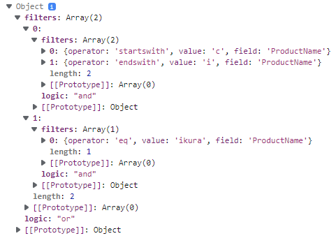 (Product Name starts with 'c' And Product Name ends with 'i') OR Product Name is equal to 'Ikura'