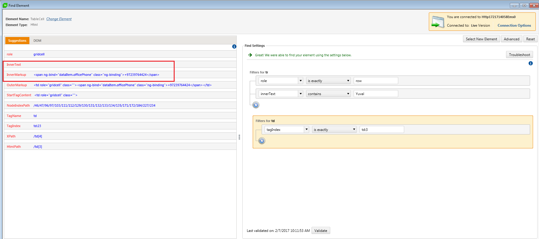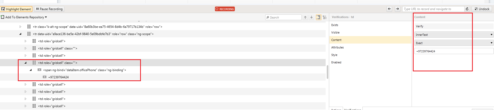 when recording the inner text appears as expected, but while executing verification step the value returns empty. also on editing element in live the inner text appears empty. see attached images.