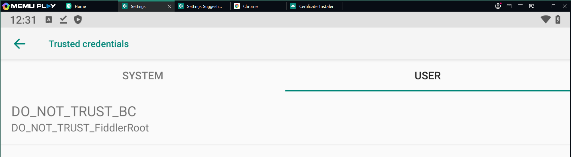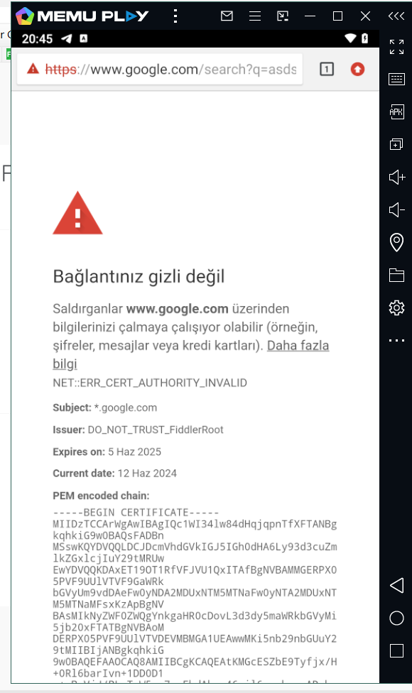 Fiddler classic was working smoothly in the Memu play emulator application, but then the emulator crashed. I updated it. Now, the android certificate is in the system section, but Google is giving error that certifica is not trust, it was giving errors, and I was monitoring the https traffic of applications such as Telegram, Twitter, Clubhouse without any problems. While I can download on my own PC and Android, I can't right now. error. However, after closing fiddler, I start the download and open it again, the download continues. I deleted and reinstalled Memu 2 or 3 times and tried again, it still gives the same error. What do you think is the reason? Also, I haven't tried any other 2 or 3 emulators. I get the same error on them too. I have been using it for 1 month without any problems. I'd appreciate it if you could help. Thanks in advance