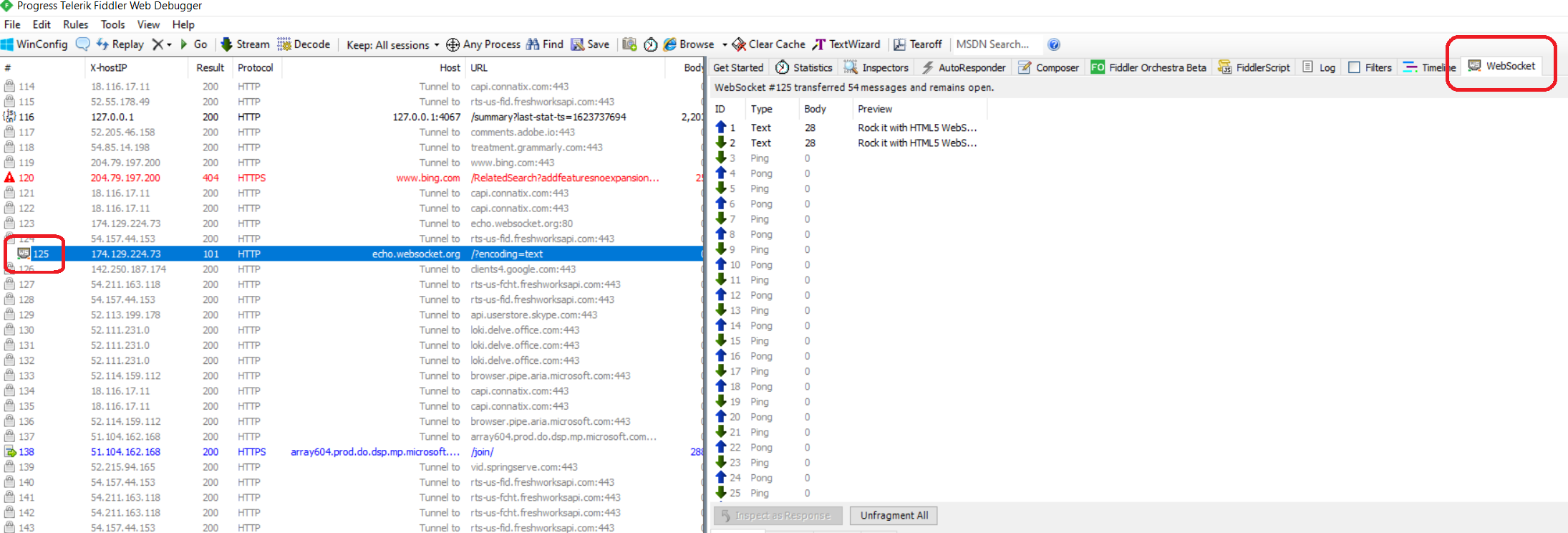 Thank you for the provided SAZ archive. The problematic sessions are indeed using a protocol that looks similar to WebSocket but actually is something different. We are currently unable to identify the protocol, and this in case the Fiddler is not trying to decrypt the traffic but directly proceeding with the tunnel.