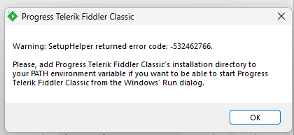 During the installation of the app I get this screen saying Unhandled Exception:System.IO.FileNotFoundException:Could not load the file or assembly system.core. I also got another error saying "Please add Fiddler classic installion directory to path environment variable". I have included the image. But the app is installed and after that when I try to launch it is not running. Nothing happens when I run the app.