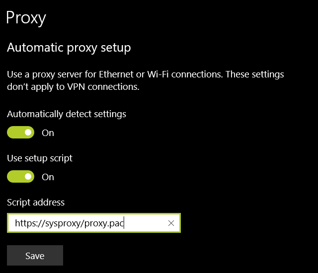 In IE, I do not have any entries in Internet Options -> LAN Settings -> Proxy Settings (and these settings are now blank & disabled). There is an automatic config script.