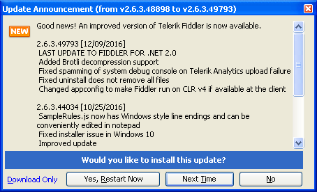 Unfortunately it doesn't. I runnin Fiddler 2.0 on WinXP with NET 2.0. Its installed with version 2.6.3.48898. Next i check for updates and its shows me about newest version 2.6.3.49793 available. But when i press to download update it downloadin da same oldest version 2.6.3.48898. And im runnin in circles.