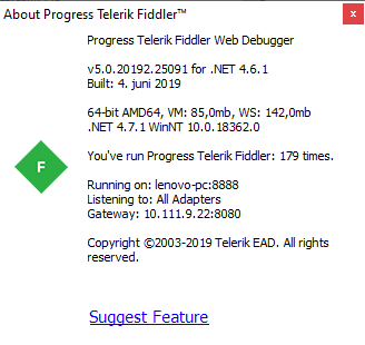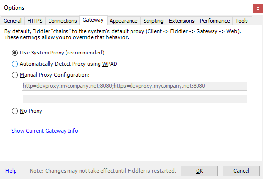 Suddenly my Fiddler installation is no longer able to forward traffic to my upstream system proxy, if I use the Fiddler Gateway setting "Use System Proxy (recommended)". The proxy is manually set up in my Windows 10 Proxy settings to "http://devproxy.mycompany.net" port 8080 and works fine for e.g. requests from Chrome (without Fiddler).