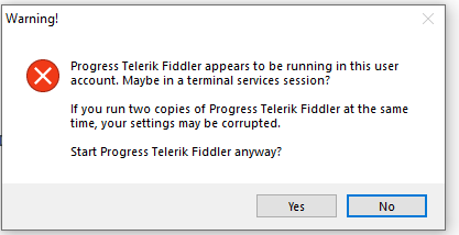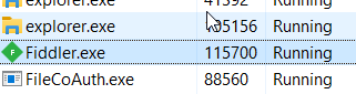 4. The Fiddler Startup error is also a concern as this might also be the cause. Do you know if Fiddler is being ran as a Service, in the command line or by some other process? I recommend opening up Task Manager and stopping all Fiddler.exe instances. See the below screenshot for more information.