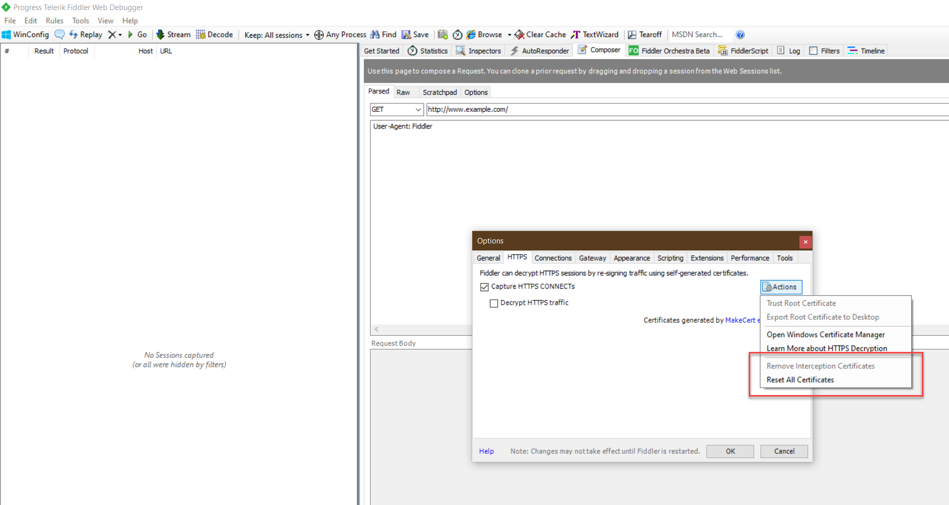 An additional area of troubleshooting is removing the intermediate certificates which can be removed directly from within Fiddler Options menu. See the below screenshot.