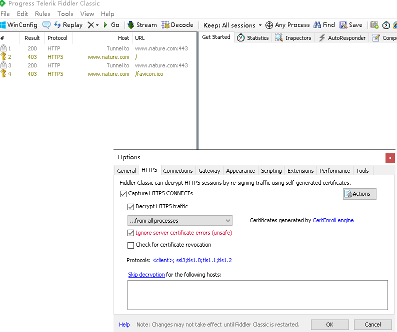 When accessing the nature website via fiddler, if you check Decrypt HTTPS traffic, error 403 forbidden will appear, unchecked resolve https can be accessed normally. As you can see in the picture below: