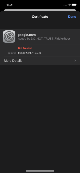 And if I click "view the certificate", it shows that the google.com certificate, issued under the Fiddler root, is "Not Trusted" - with no indication as to why???
