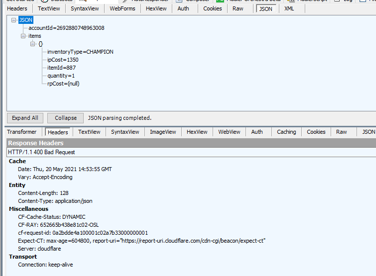 Hello Filip again, so im playing around with fiddler on League of legends and i get this error when i change some of the value, is there any fix>?