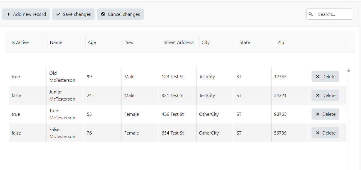 Since the Grid columns bind to properties of a complex object (i..e, "Person.IsActive", "Person.Name". and etc.), specify the complex objects "Person" and "Address" in the Model() configuration of the DataSource, as per the example below: