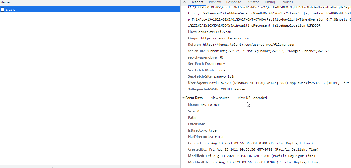 I have added a FileManager to an MVC view following the code in the Basic Usage demo (https://demos.telerik.com/aspnet-mvc/filemanager) and everything is working correctly, except when I try to implement the code for the New Folder button (Which fires the Create command on the DataSource).