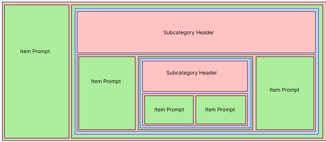 The general structure of Cells/Rows/Tables that I end up with following this recursive build is described in the second attached image. Rows are red, cells are green, and tables are blue. Perhaps there is another way to build the header that I am not considering.