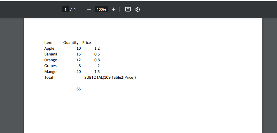 to conver xlsx file to pdf. In source xlsx file a have a Table and a formula '=SUBTOTAL(109, Table2[...]) that work in xlsx, but when i export it to PDF i need to have the calculated value, but instead im getting the string '=SUBTOTAL(109, Table2[...]) .