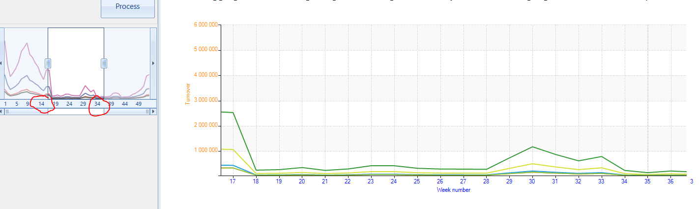 Generally speaking there isn't an easy way to get the labels in the range area. You could use the StartRange and EndRange properties. The values of these properties are of type double and between 0% and 100%. From the photo you sent I see that you use ChartView with the ScatterLine series. Correct me if I am wrong.In this case, you can get the last label in the RangeSelector control and calculate the start and end of the range area. For example:
