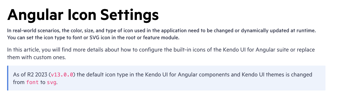 Indeed, you are correct that starting from R2 2023 or v13.0.0 of the Kendo packages, the default icons inside the Kendo UI for Angular components have been changed to svg: