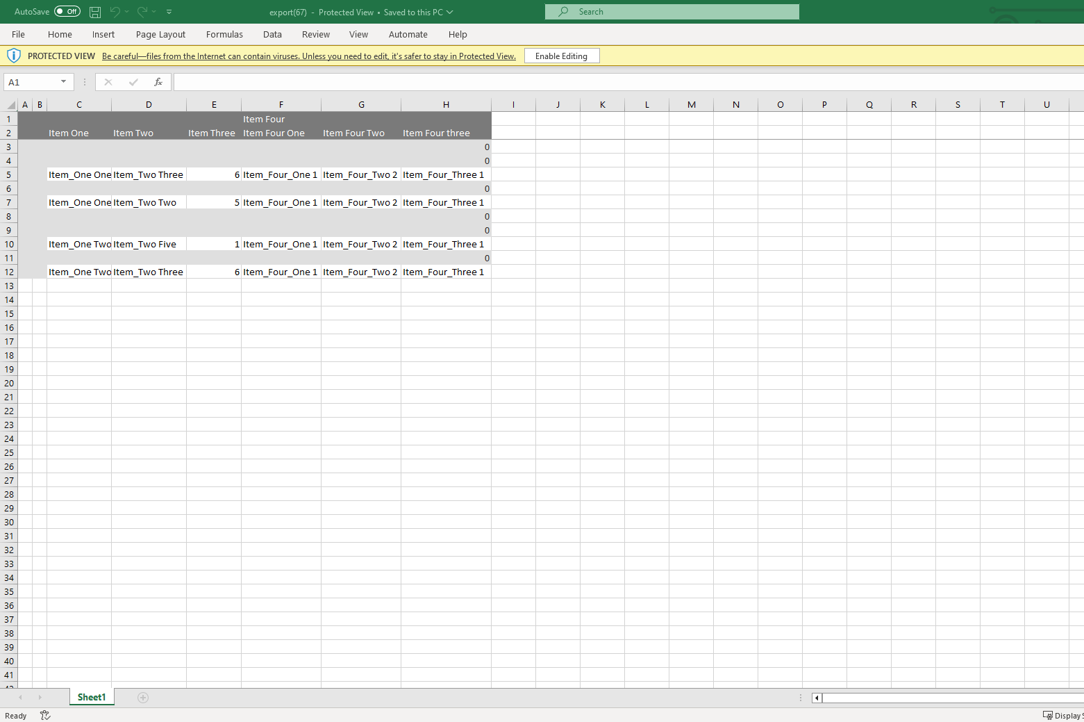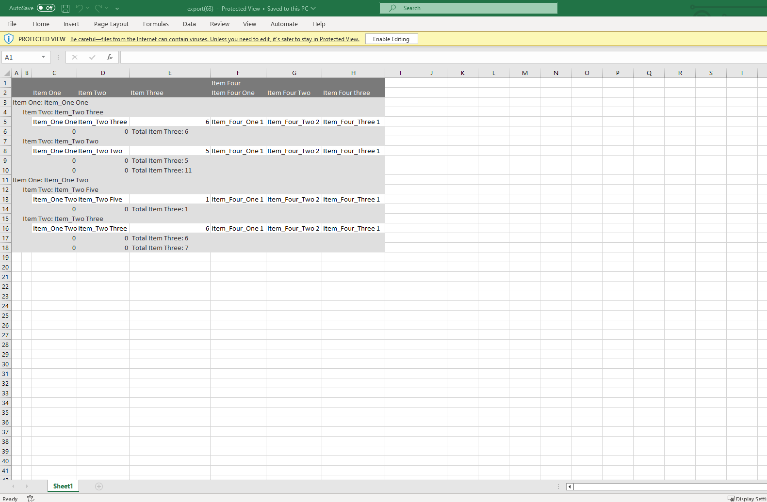 4. Export the Excel file and notice that it doesn't render the group headers correctly. This only works for the excel group *footers*.