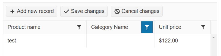 }In terms of the filtering of the "Category" column, if you use the filter operator "IsNull", the records with "Name" property "null" will be filtered as expected: