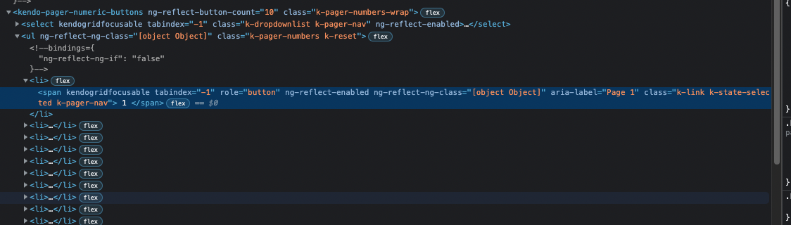 checking with the working demo from the kendo page the pager as rendered as buttons instead of li and there is a class k-selected which is also defined in the theme: