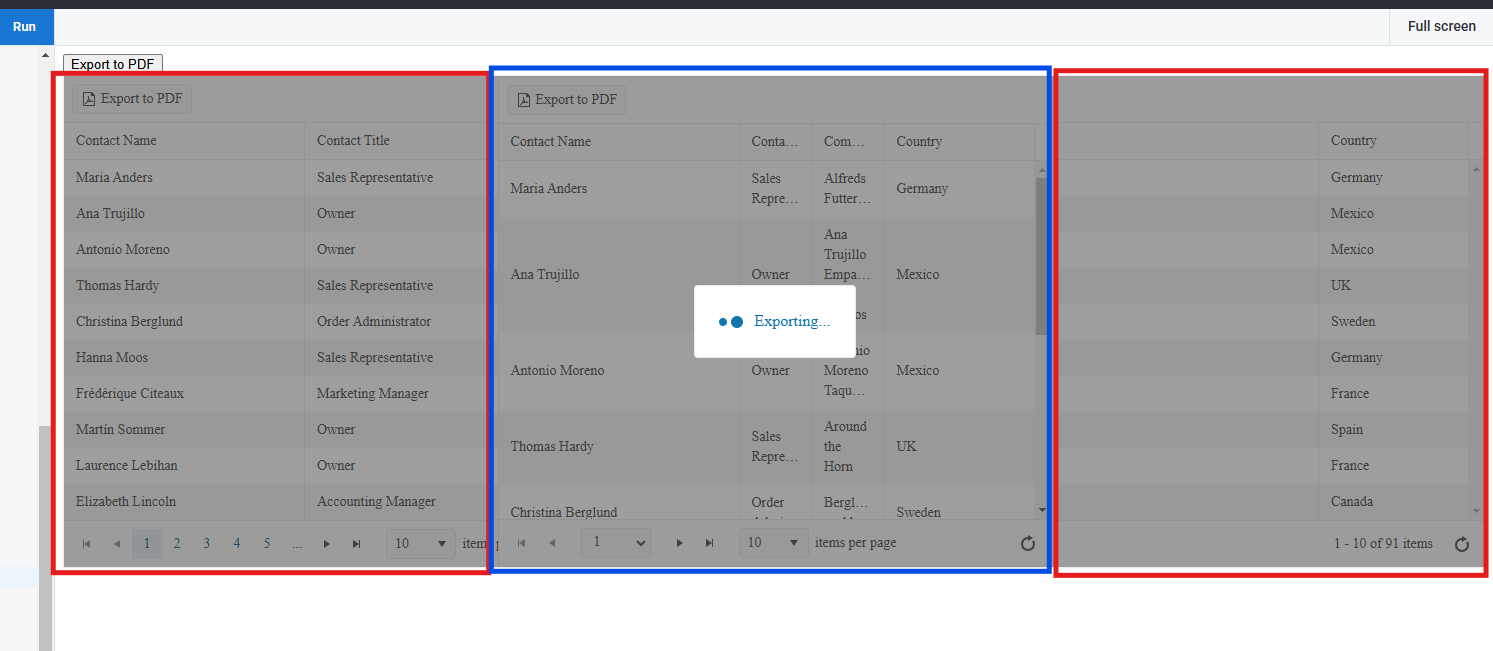 Yes, export works correctly, it export what I want. The problem is that on the gui the user sees that the pages change during this export (in this case it happens very quickly). There is no such thing when we use export to pdf from the toolbar (toolbar: ["pdf"]).