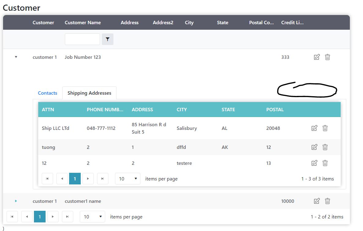 I examined the provided code and there are only 2 items added to the TabStrip, one for the Contacts grid and one for the Shipping Addresses grid.