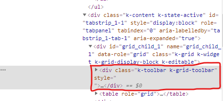 Right click on the TabStrip, select Inspect Element, in the DevTools find the element with classes "k-grid k-widget", expand it and see if there is an element for the toolbar.