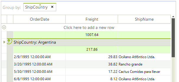 To show a total summary for all groups, you can use the ShowTotals template property. The totals are calculated for the child rows of all groups. You can control if the summary rows are top or bottom pinned even in grouped RadGridView.
