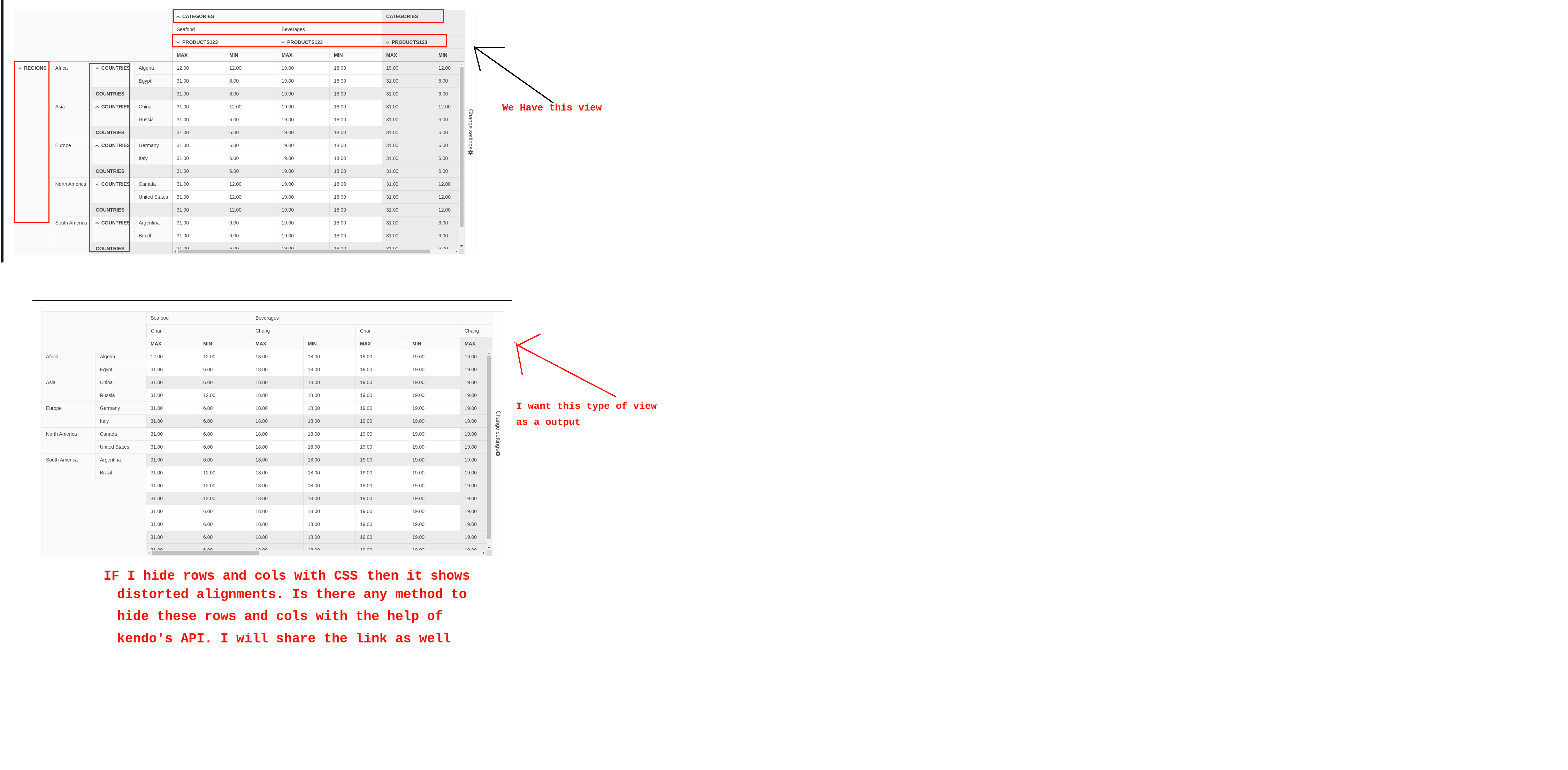 Yes, But see the attached image below. Want to hide Countries and Categories as well. How to do it? Also keep it Asia, Africa , Europe etc as it is. I don't want to hide these columns. and see the second image, i want the same output which shows in second image without red highlighted