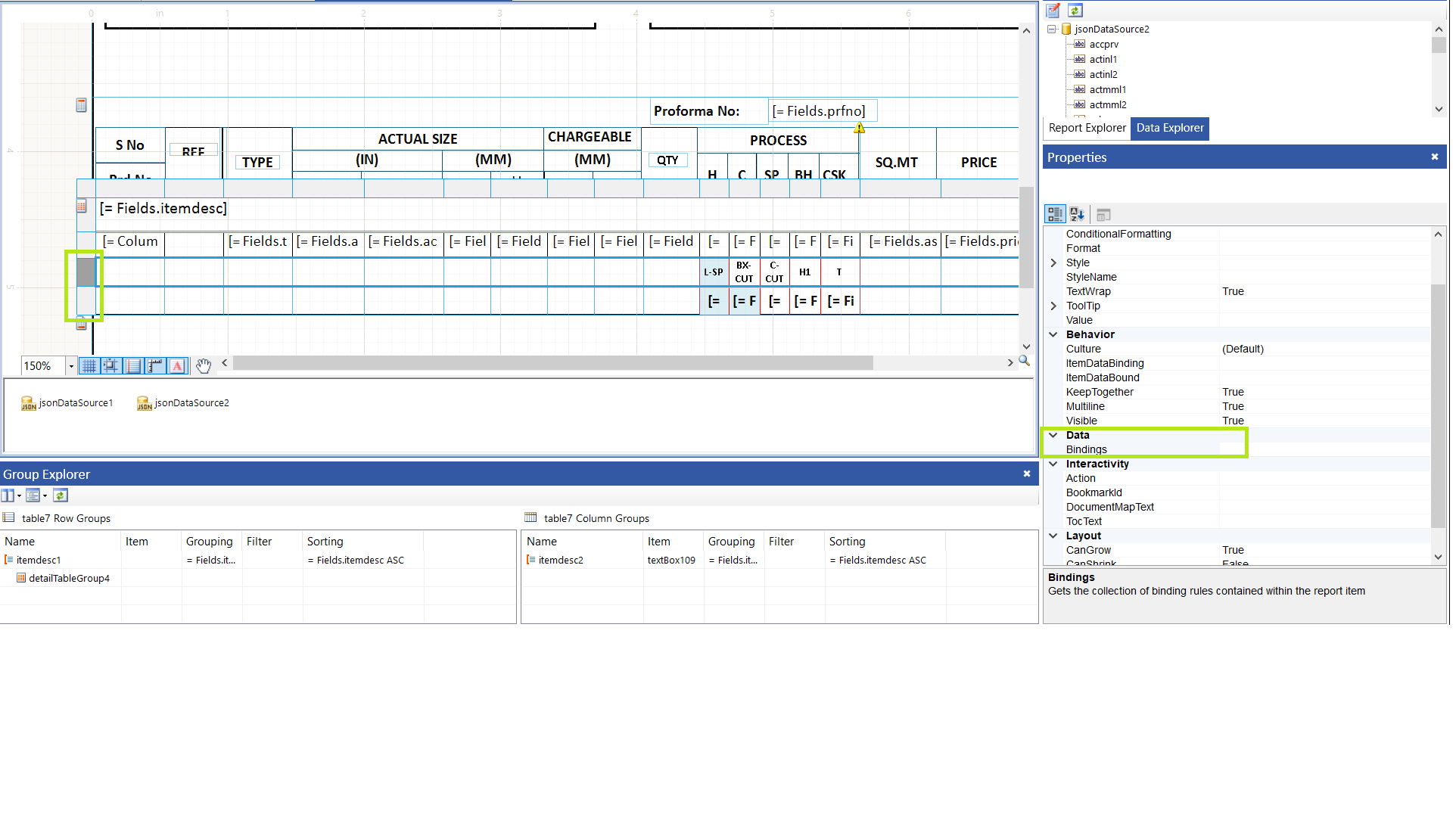 In the attached report, I see that the item textBox43 has the binding from the attached image but that is the only textbox on that row that has such a binding. You have to apply the biding for the other textbox items either individually, for example:
