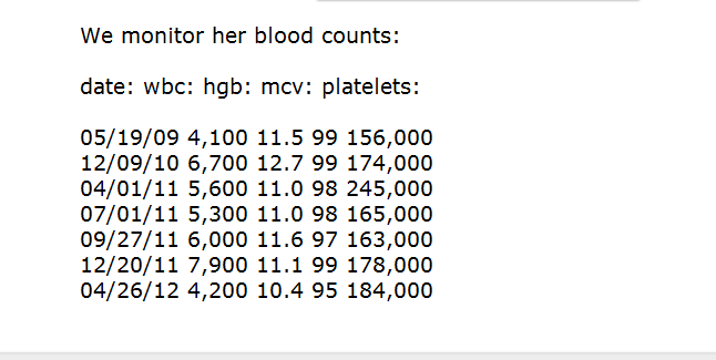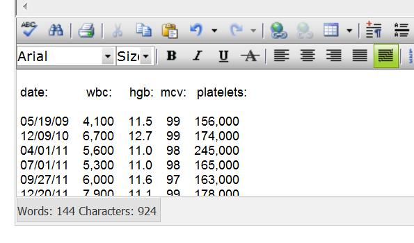 Yes, as I edit this post, I can see that the text lines up fairly well, and this is taking into consideration that in each column I am asking to have the values right aligned, which they do not do perfectly. If I were to try to do this in OncoEMR, the figures would not line up at all. I mean, they would line up fine when I enter them in the RadEditor, but when they are posted onto the note, they are all scattered. So I have to adjust, adjust, adjust over 3 or 4 minutes to get it just right.