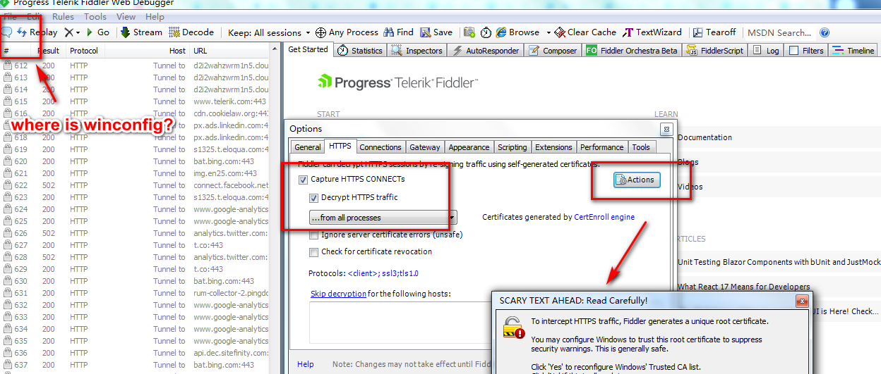 2. I wonder where the 'winconfig' is. I am watching a video tutorial where there's a winconfig on the toolbar of the instructor, but I don't find it on my Fiddler.