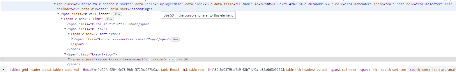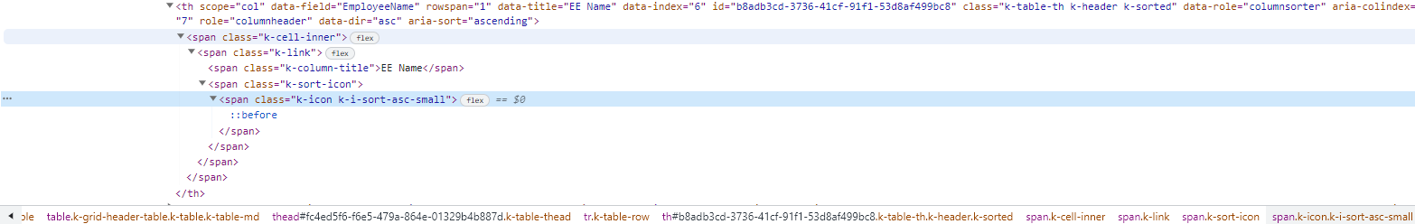 In the UI for ASP.NET MVC build 2023.1.425 build we are seeing an odd behavior where there is a duplicate sort icon on the column that we have set as the initial sort in the grid datasource definition section (ref 1st screenshot). In comparing the generated HTML for the UI for ASP.NET MVC and UI for ASP.NET CORE (both 2023.1.425) where both have the same grid datasource initial sort set there is a variance between the HTML generated/shown for the header column in that an extra "k-icon-sort" span tag is being added (ref and compare 2nd and 3rd screenshots). The grid datasource default sort column is defined as ".Sort(x => x.Add("EmployeeName").Ascending())" and the grid Sortable configuration is defined as ".Sortable(s => s.SortMode(GridSortMode.SingleColumn))" in either of our ASP.NET MVC or ASP.NET CORE projects so that is not a variance and both use the the "classic-silver.css" theme so that too is not a difference so my only thought is that the generation of HTML or applying of style classes on sort action (via some kendo-xxx.js file?) is the difference and the reason why the MVC version shows the dupe icon but not the CORE version.