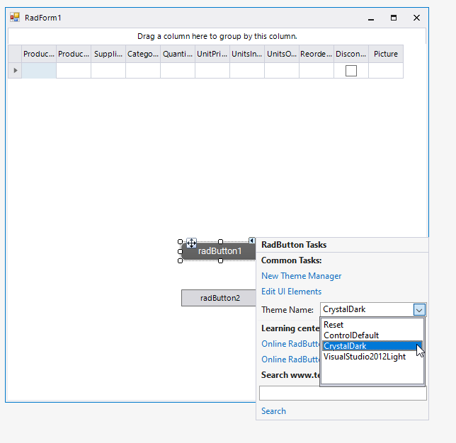 I have a button that will use a different theme called "RedButton". I can force the button to use the different theme at run time via RadThemeManager using: