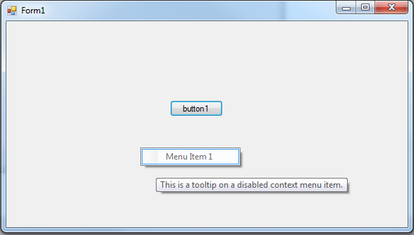 In the following example we would not see the tooltip when menuItem.Enabled = false; Can we get a fix for this? Our work-around is causing other problems.