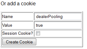 i met an issue about cookie today. In my web application, there is a debug page("http://wwwqa.inventory.ford.com/debug/cookies.jsp") to add a cookie with name "dealerPooling" and value "true", if i add this cookie, then a proper page will display.
