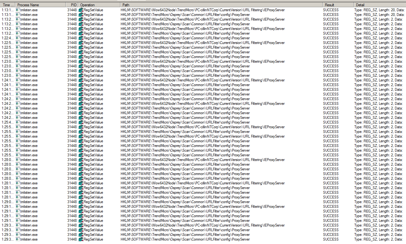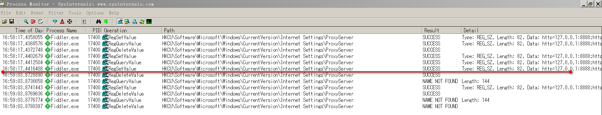 I ran Process Monitor and had two filters. One on path contains 'proxyserver' and one on operation contains 'set'. The attached capture shows all the changes are done to registry keys which belong to TrendMicro. I don't see keys belonging to the system's proxyserver. Yet these changes have triggered Fiddler's warning.